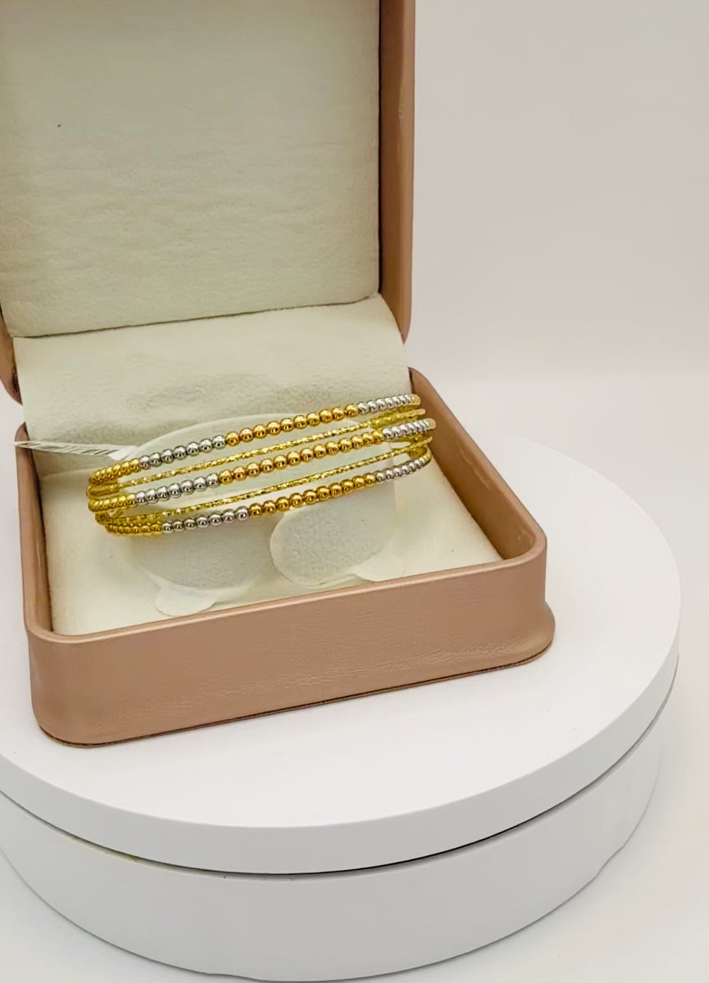Add a touch of timeless charm to your collection with this 18K Gold 3-Tone Beads Open Bangle (17cm) — a refined piece that brings Middle Eastern elegance to modern Australian style. Handcrafted from solid 18 karat gold, this bangle showcases a delicate combination of yellow, rose, and white gold beads, beautifully balanced in a flexible open design that fits comfortably on the wrist.